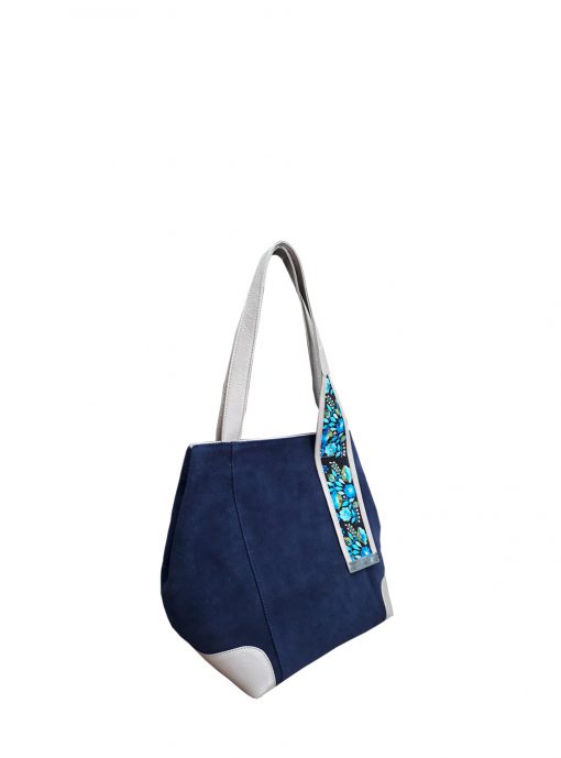 Outside: Inspiring design. Features an embroidered flower strip and purple leather edges. Silver-plated metalware with magnetic button lock.